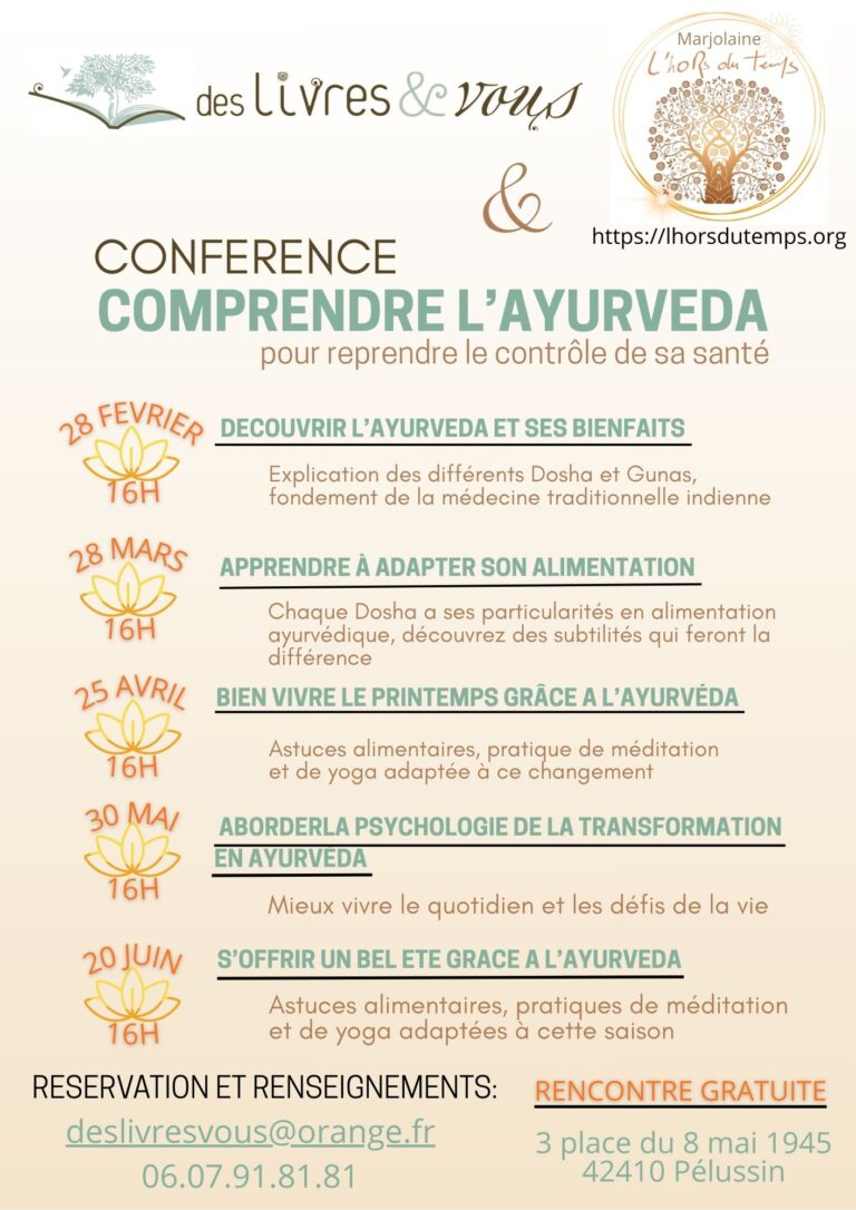 Venez découvrir l’ayurveda à travers les conférences que j’animerai dans la magnifique librairie de Laurence à Pélussin, au doux nom de Des Livres Et Vous.
